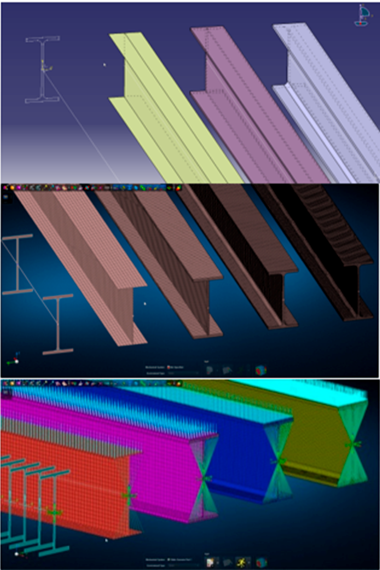 - 2D shell elements represent the actual beam geometry in terms of the midsurfaces of the profile and each element refer to both material and a thickness. It may take an effort to derive midsurfaces if the origin is solid geometry. However, simple to modify the web and flange thickness separately for initial optimization purposes. The shell models provide excellent deflection of the representation (both web and flanges) and the stress recovery enables a strong insight of stress contours and components.
